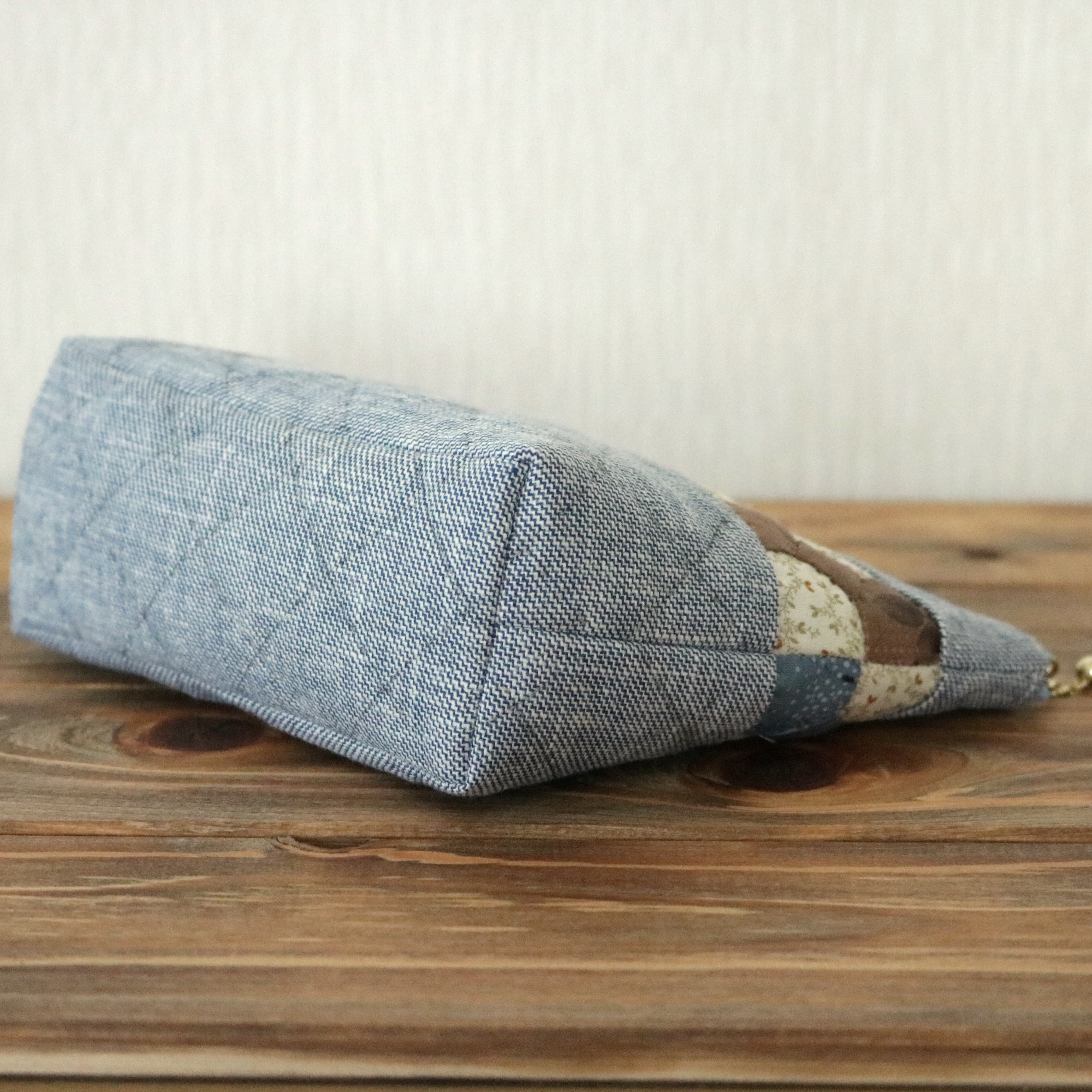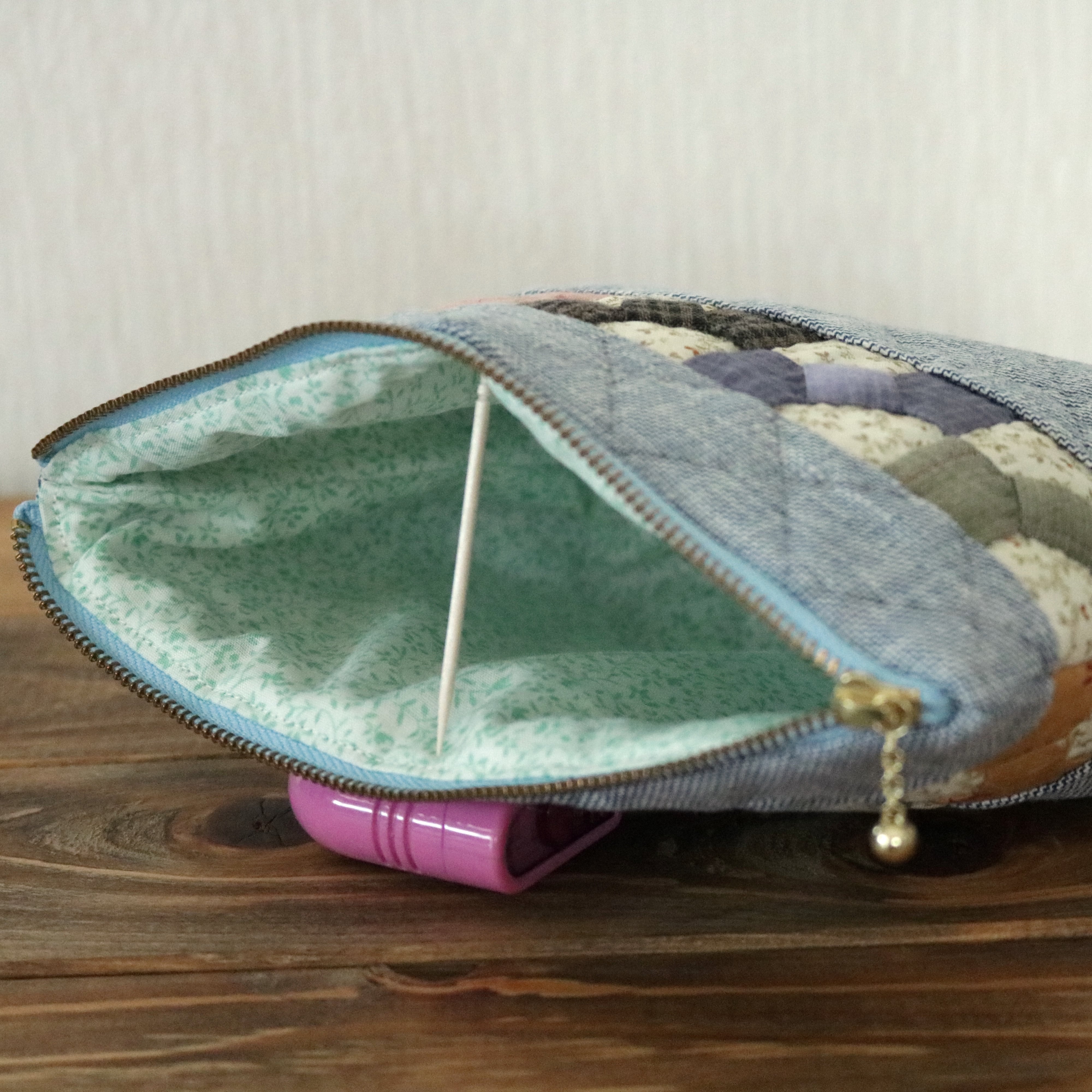 ポーチにはぐるっと一周パッチワークのパターンを入れました。